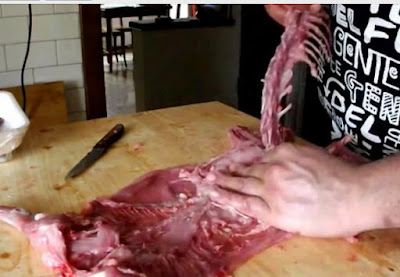 iniziamo ad incidere dalle cosce seguendo l'osso e spaccando con e mani le giunture